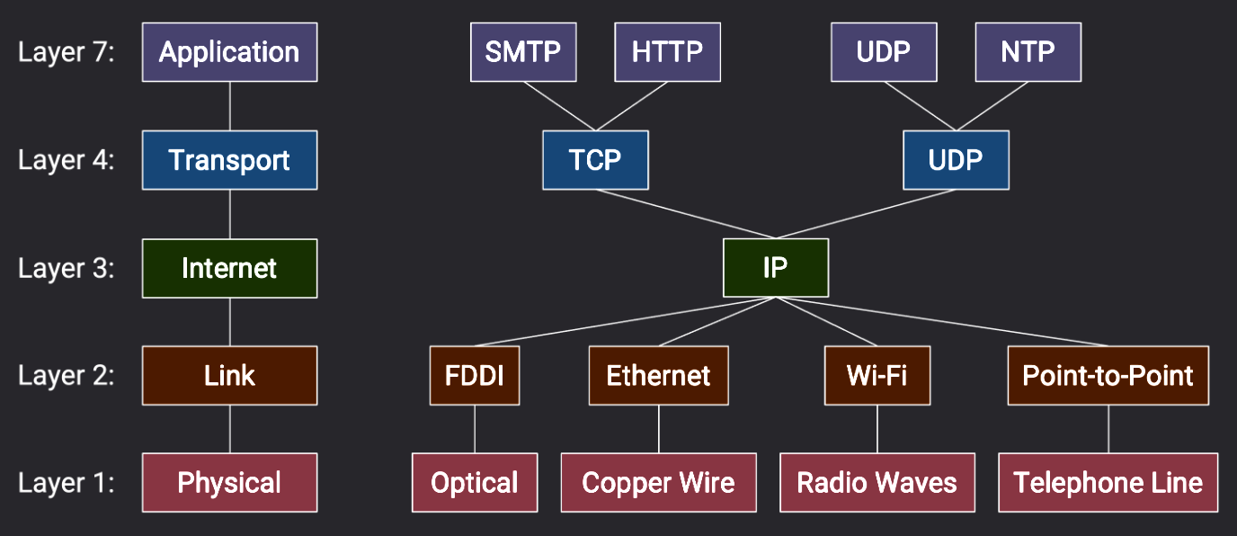 现代互联网的具体协议如上图所示,形成了一个上下宽中间窄的图像。可以发现在第三层只有 IP 协议,互联网的每一个人都必须使用 IP 协议才能传输数据。